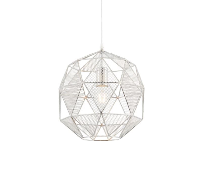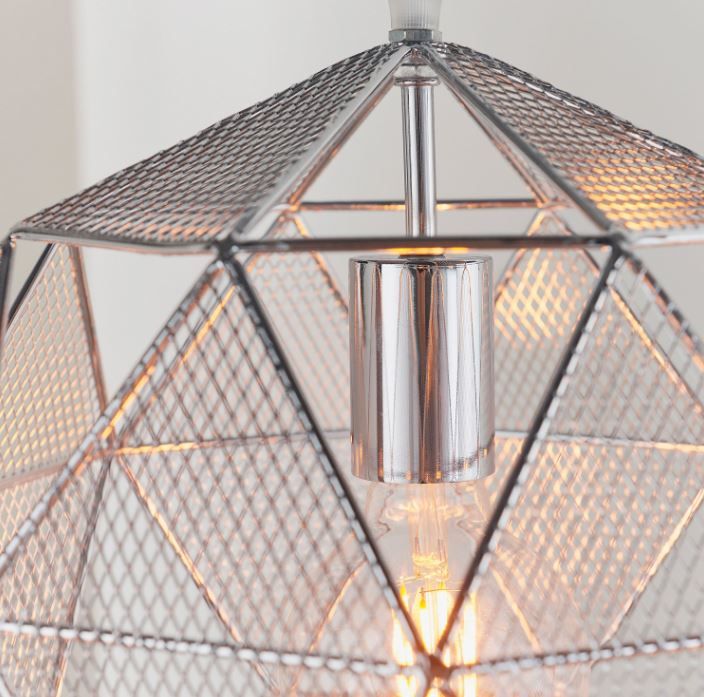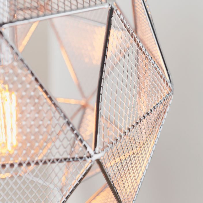 The Armoura pendant is on trend with its geometric, angular design and chrome effect finish. Formed from a collection of mesh triangles, the cut outs create a fabulous light effect. Dimmable and compatible with LED lamps. Also available in a copper plate.