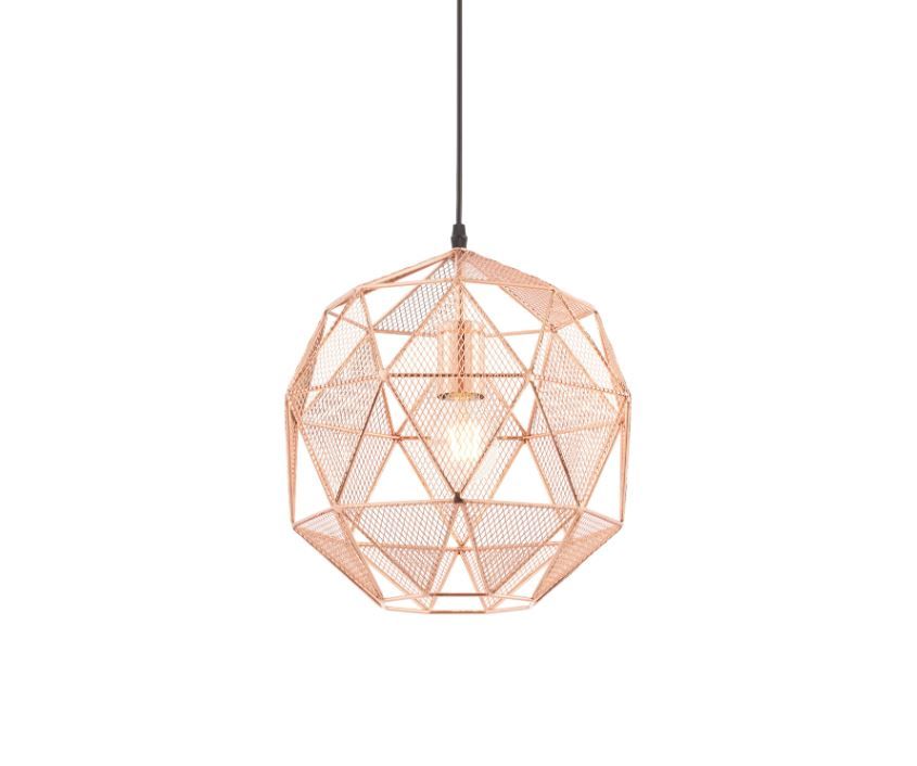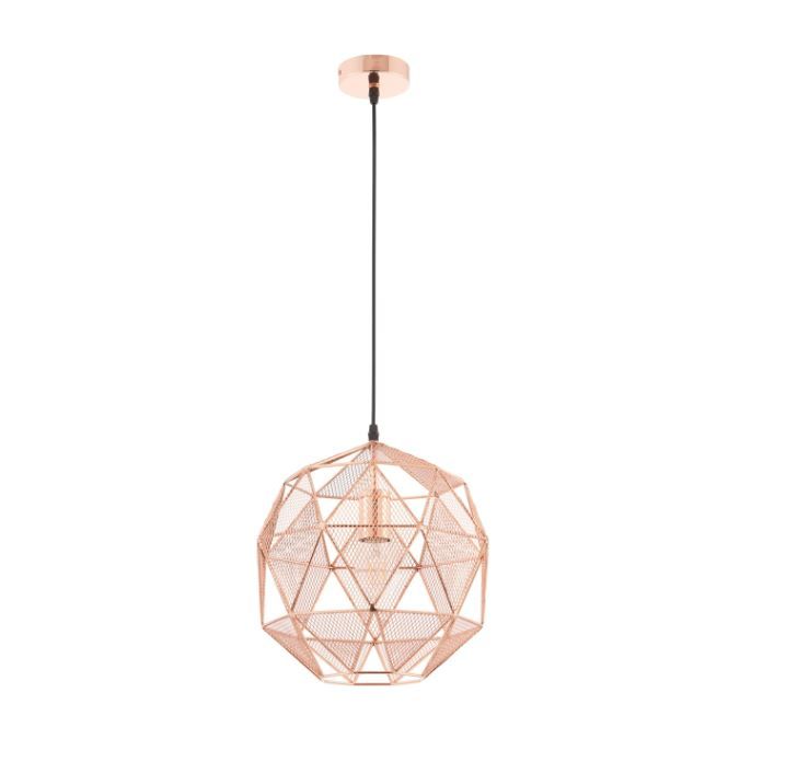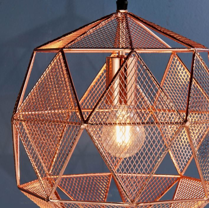 The Armour pendant is on trend with its geometric, angular design and copper plate finish. Formed from a collection of mesh triangles, the cut outs create a fabulous light effect. Dimmable and compatible with LED lamps. Also available in a chrome effect plate.