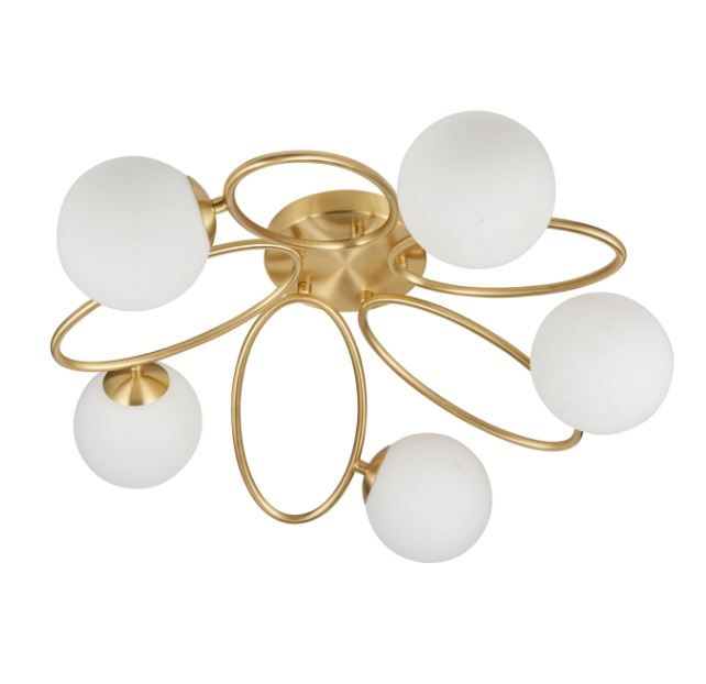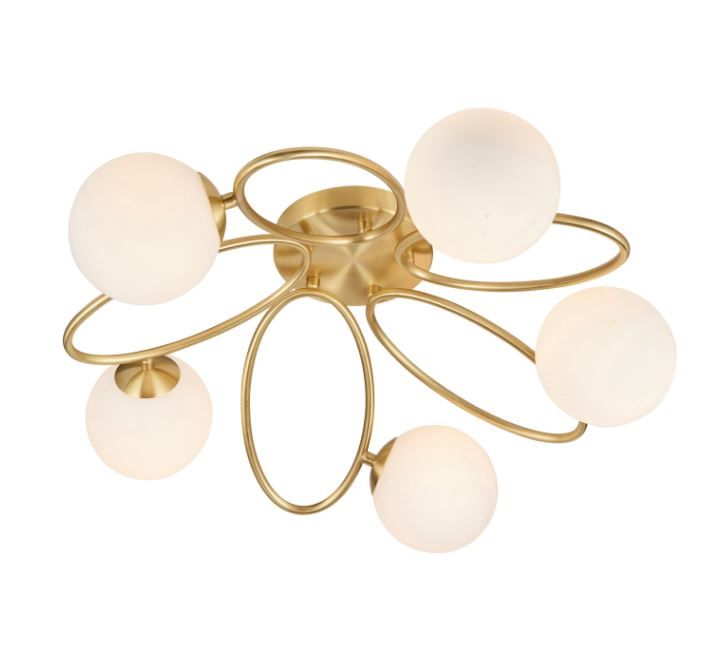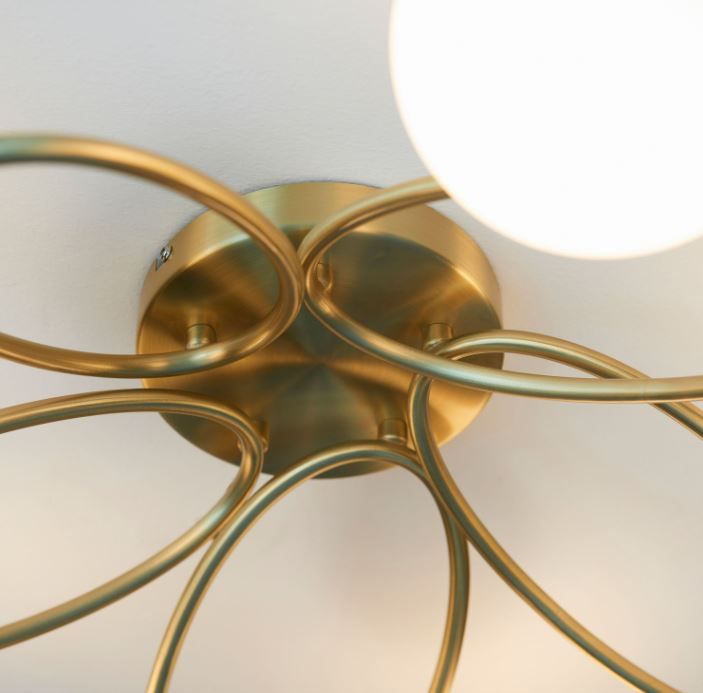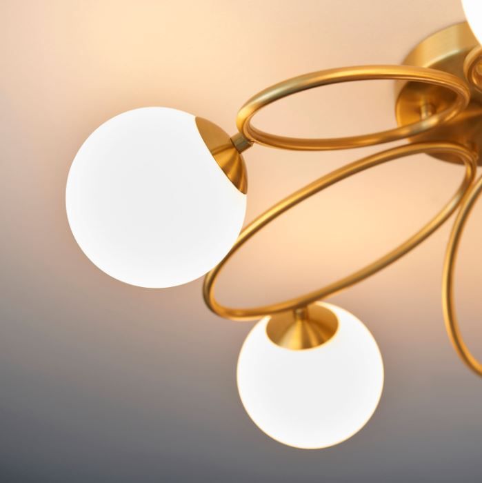 Contemporary semi flush ideal for low ceilings. Trendy oval metal work in satin brass plate finish pair with matt opal glass shades to create this stylish dimmable light.