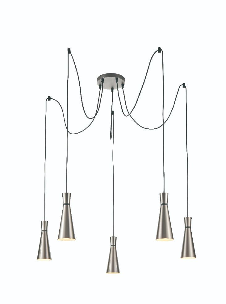 Metallo is a 5 light pendant light fitting, finished in satin nickel with matt black detailing. The pendants can be mounted individually at any desired point.