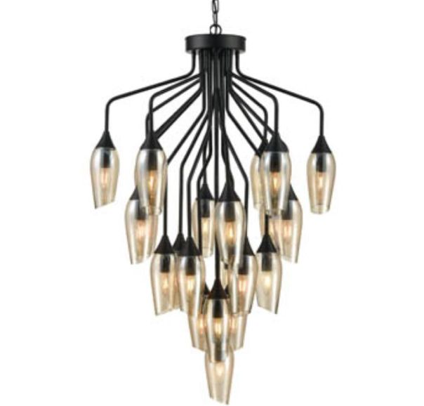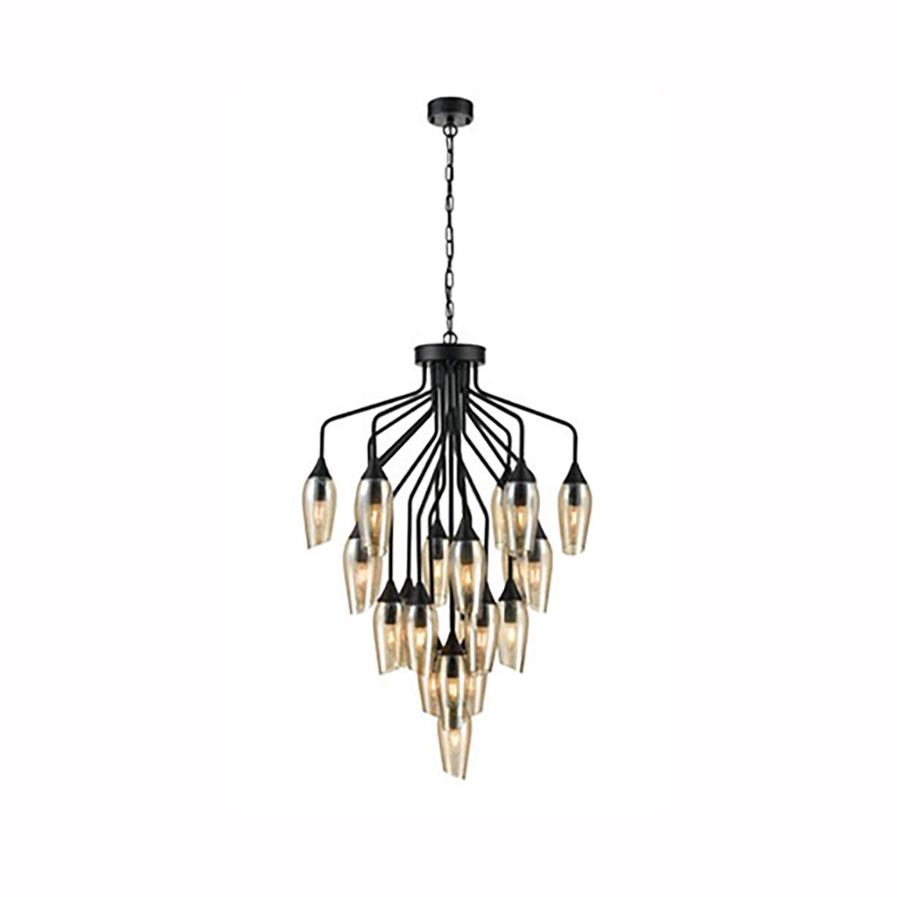 Tulipano is a 22 light chandelier light fitting, finished with tulip shaped amber glass shades with matt black detailing and black braided cabling.