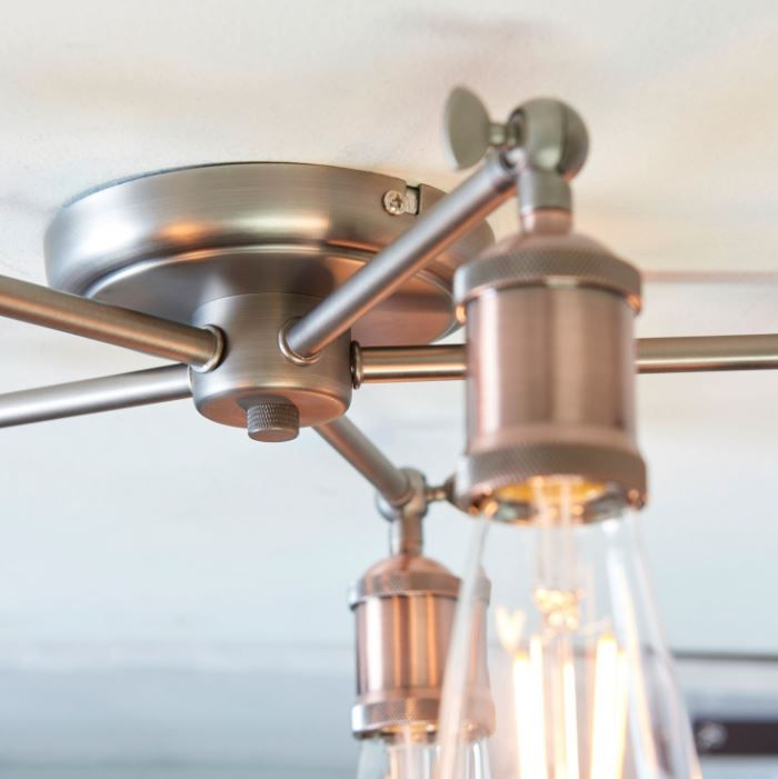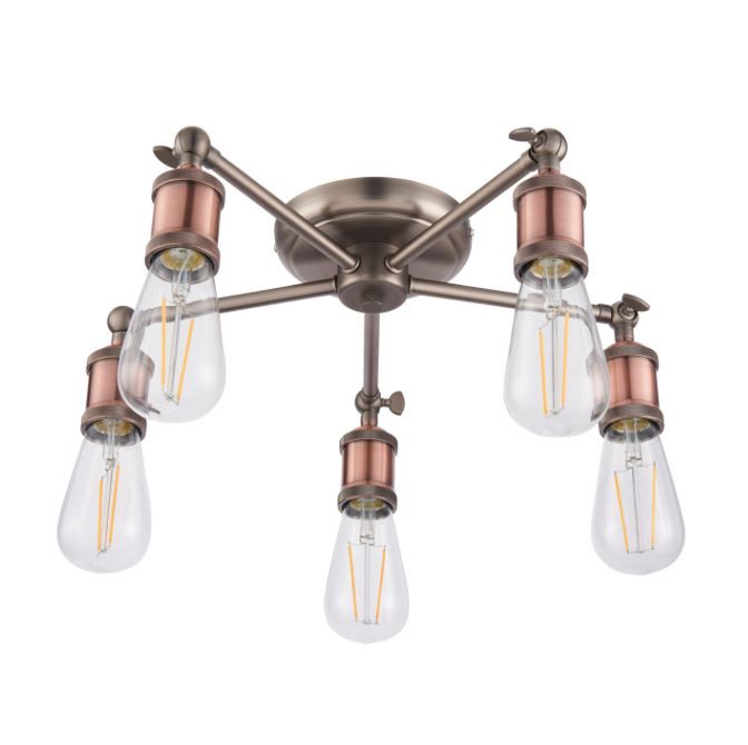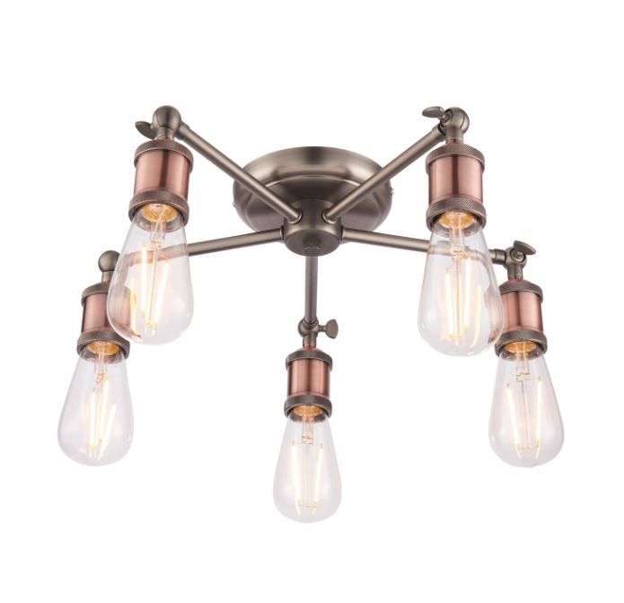 An industrial styled compact ceiling light, finished in aged pewter and aged copper, making it bang up to date with on-trend ‘resto’ styling. Adjustable knuckles and knurled lamp holders complete the authentic look. Compact design makes it perfect for low ceilings, perfect when paired with filament LED lamps.