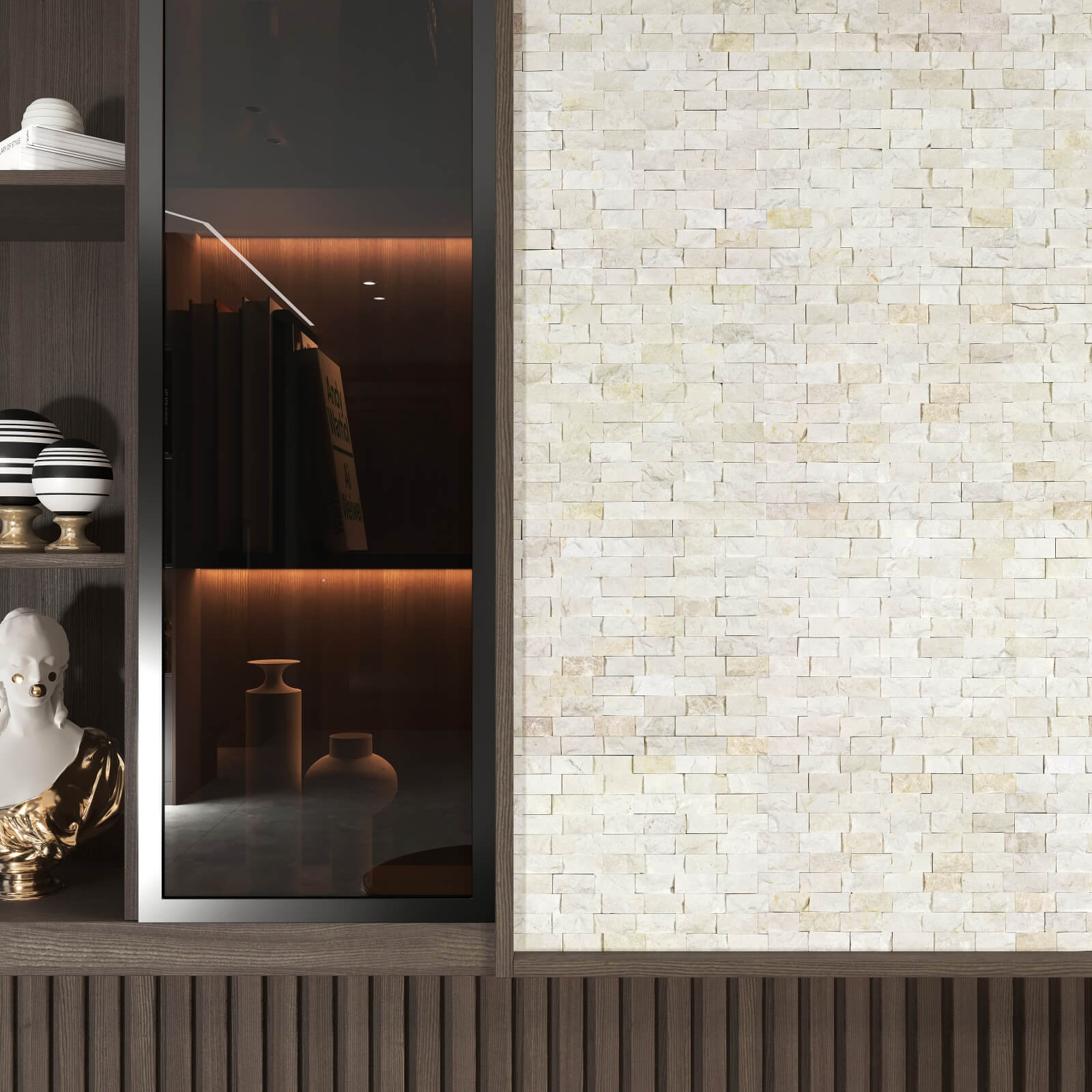 These split face mosaics, which are made of Crema Marfil tiles, will look great virtually anywhere. These gorgeous split face tiles can be installed on garden walls or even the front of your house. You could even design the modern media wall or to be used on a dry bathroom wall of your dreams.