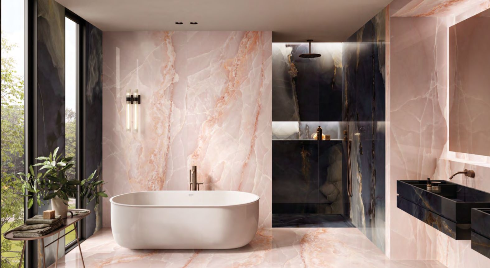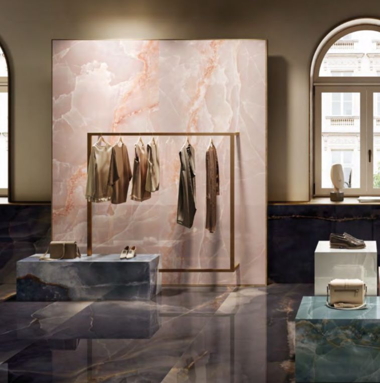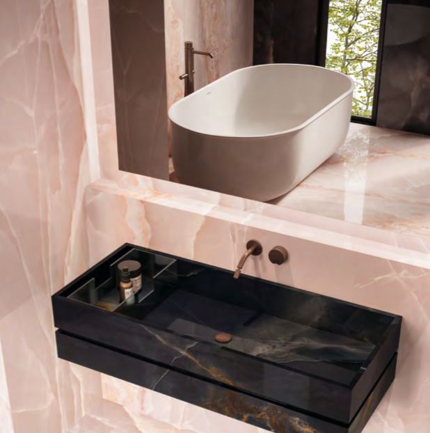 Tele di Marmo La Supra Onyx represents an important step to ongoing research dedicated to the finest and most precious of minerals: the shade variations and transparencies typical of this stone are layered beneath surfaces to bestow a wonderful three-dimensionality and inner gleam. In an extremely refined, intriguing palette of colours – from the enticing Ivory to the elegant Pink, the deep Green and Blue and the dramatic Onyx Black – with its splendid large size of 120 x 278 cm, Tele di Marmo Onyx offers a depth and richness of colour never previously achieved. Moreover, the SilkTech technology provides excellent anti-slip performances while still retaining the ceramic surface’s soft, silky feel.