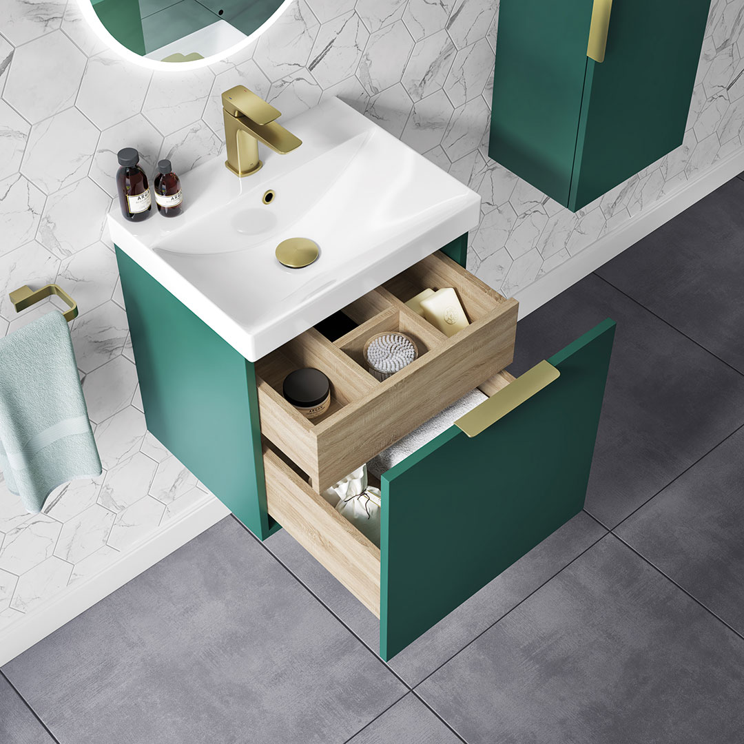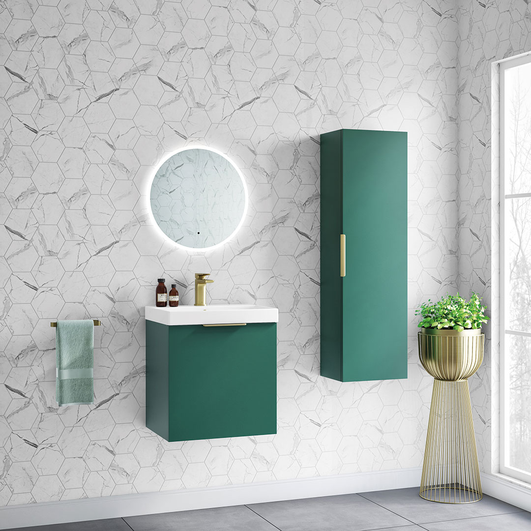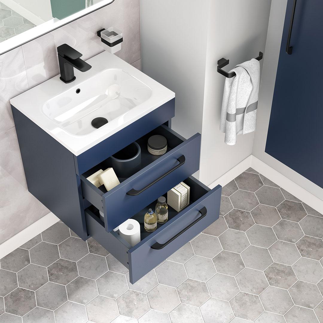 Discover the sleek and versatile My Life Axel Bathroom Range, designed to bring contemporary elegance and practicality to your bathroom. The collection showcases a selection of minimalist units, including the 500mm Wall Unit, 600mm Wall Unit, 950mm Wall Unit, and the Axel 1 Door Wall Mounted Tall Boy, each crafted to offer optimal storage while maintaining a compact footprint. Available in sophisticated finishes like deep blue matt, forest green matt, lead grey matt, and white gloss, the Axel range caters to diverse aesthetic preferences. Each unit is characterised by clean lines and a smooth surface, providing a modern look that complements any bathroom decor. Customisation is at the heart of the Axel collection with optional handles available in chrome, matt black, brushed brass, and gun metal. These choices allow you to personalise the units to match your style and the fixtures in your space, enhancing the overall cohesion and design integrity of your bathroom. Whether installed as a standalone piece or combined for a coordinated look, the Axel bathroom furniture range promises not only style but also functionality, making it an ideal choice for both new installations and renovations seeking a touch of modernity and elegance.- Unit & Basin: H 555 x W 515 x D 395mm