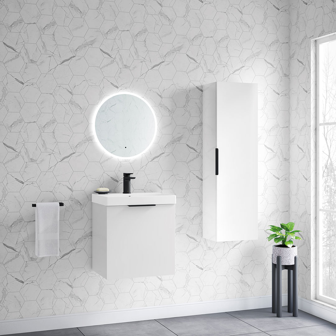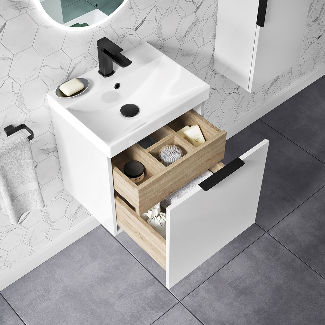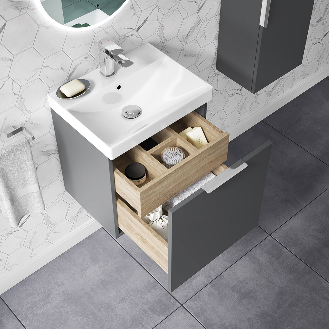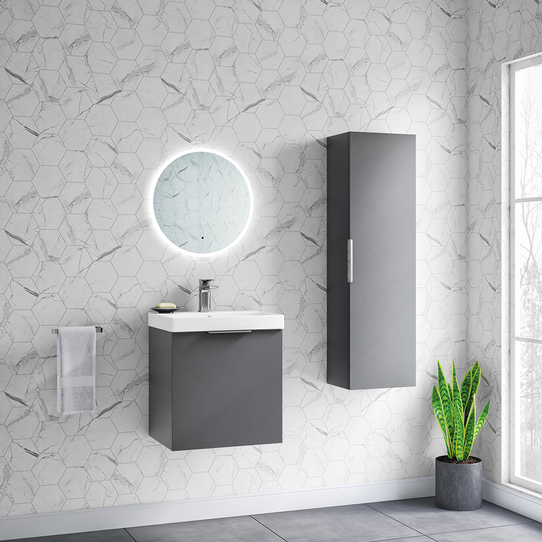 Discover the sleek and versatile My Life Axel Bathroom Range, designed to bring contemporary elegance and practicality to your bathroom. The collection showcases a selection of minimalist units, including the 500mm Wall Unit, 600mm Wall Unit, 950mm Wall Unit, and the Axel 1 Door Wall Mounted Tall Boy, each crafted to offer optimal storage while maintaining a compact footprint. Available in sophisticated finishes like deep blue matt, forest green matt, lead grey matt, and white gloss, the Axel range caters to diverse aesthetic preferences. Each unit is characterised by clean lines and a smooth surface, providing a modern look that complements any bathroom decor. Customisation is at the heart of the Axel collection with optional handles available in chrome, matt black, brushed brass, and gun metal. These choices allow you to personalise the units to match your style and the fixtures in your space, enhancing the overall cohesion and design integrity of your bathroom. Whether installed as a standalone piece or combined for a coordinated look, the Axel bathroom furniture range promises not only style but also functionality, making it an ideal choice for both new installations and renovations seeking a touch of modernity and elegance.- Unit & Basin: H 555 x W 515 x D 395mm