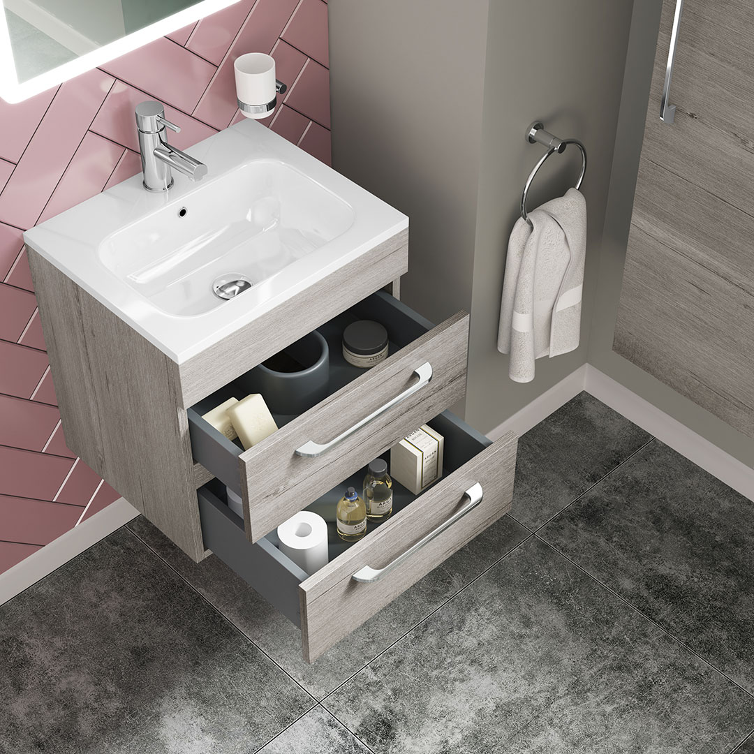 The My Life Ezra Bathroom Furniture Collection embodies the perfect blend of sophistication and innovation, designed to transform your bathroom into a seamless fusion of style and functionality. Each piece in the Ezra collection is crafted with meticulous attention to detail, ensuring it not only meets but exceeds the expectations of modern homeowners. The Ezra range offers an array of beautifully designed vanity units, each presenting a sleek, minimalist aesthetic that is versatile enough to complement any contemporary bathroom decor. Available in a choice of refined finishes, the collection emphasizes clean lines and smooth surfaces, creating a visually appealing and tranquil space. The practicality of the Ezra collection is evident in its robust construction and thoughtful design. Each unit provides ample storage space, allowing for a clutter-free bathroom environment. Soft-close drawers and doors enhance the user experience by ensuring quiet operation and durability, adding an extra layer of convenience and luxury. Ideal for those seeking a modern yet timeless bathroom update, the Ezra collection promises elegance and functionality. Its streamlined design makes it a standout choice for anyone looking to elevate their bathroom with a touch of class and sophistication. Whether you are undertaking a full renovation or a simple update, the Ezra collection offers versatile options to enhance your space with durability and style.- 500mm 2 Drawer Wall Unit Only
