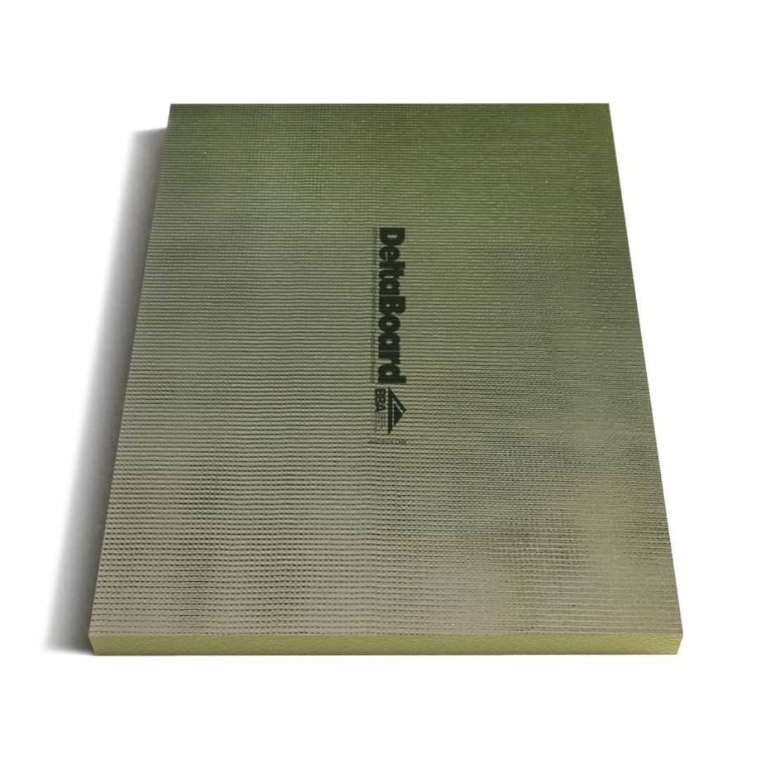 DeltaBoard is manufactured in the UK using high density extruded polystyrene which provides excellent insulating properties. The extruded polystyrene core has a factory applied reinforced cement coating which promotes a perfect bond with cement based adhesives and levelling compounds whilst offering excellent impact strength, sound reduction and fire resistance
