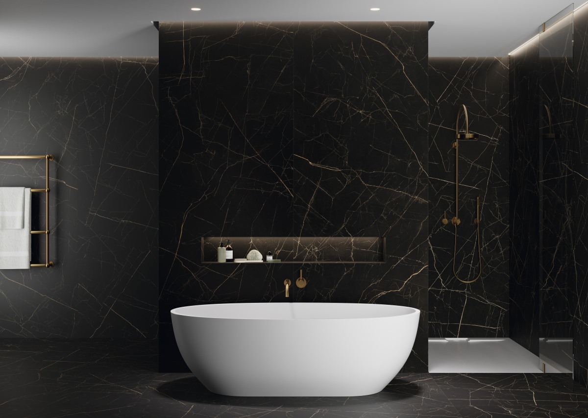 This is the go-to choice for tile drenching. Large slabs mean fewer grout lines and a more seamless look. Our Coverlam range from Grespania is especially popular – lightweight, ultra-slim, and available in incredible finishes like marble, concrete, and stone.